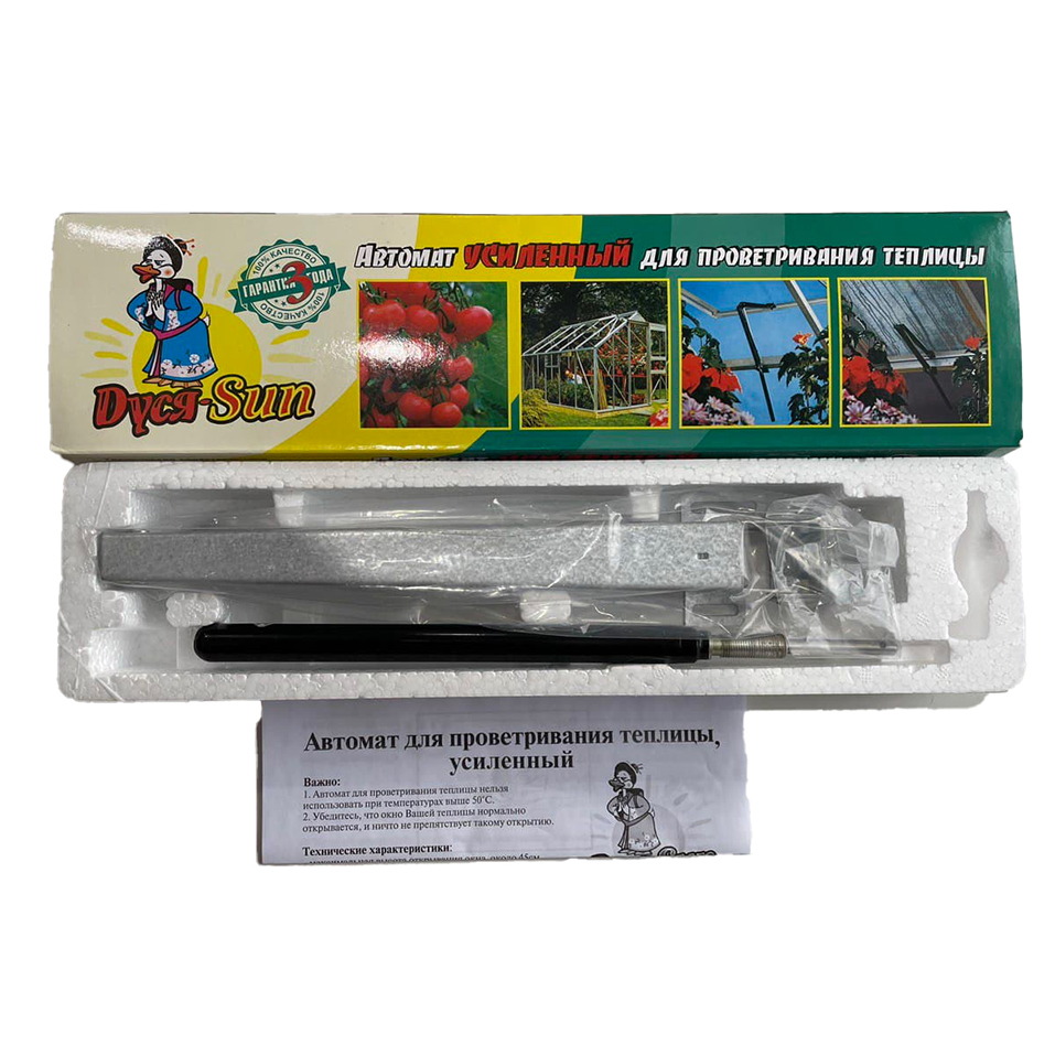 Один конец гидроцилиндра крепится к продольной части жесткости теплицы, а другой — к форточке. В гидроцилиндре жидкость расширяется при температуре от 16 до 20°C и сжимается при температуре ниже 25°C. Шток гидроцилиндра двигает рычаги автомата, открывая или закрывая форточку.